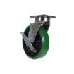 Made of 100% pure polyurethane tread (DT). Designed with a new liquid cast flow affusion that ensures a 100% bond and "zero" trapped air. Tread has been matched with a double precision rigging that offers one of the smoothest rotations in the industry. Swivel sports a high-class three layered finish: brass, nickel, and chrome. Rigid comes standard in zinc. Green tread color. 90-96 Shore A. Wheel center is constructed of polyolefin.