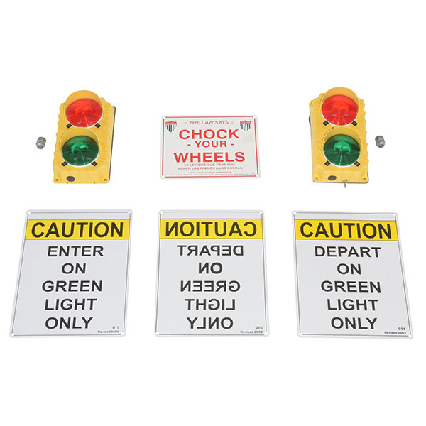 The model DTS-5, comes with two (2) yellow polypropylene traffic lights, 6-1/2"W x 11-1/2"H, each having a green and a red lens. The light containing a toggle switch is placed inside the dock area for the dock attendant, and the other is placed outside for the truck driver. Four (4) signs are included. LED model never needs bulb replacements. UL and cUL certified. Dust and water resistant; IP54 rated.