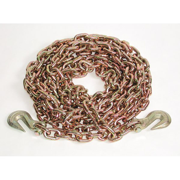With a pair of sturdy alloy steel clevis hooks, the chain assembly provides a strong connection to anchor points. The grade 70, 5/16" X 25' chain assembly is made to NACM standards per specifications of the Department of Transportation & CCMTA for tie-down use with properly marked links and aluminum tags with stamped WLL information.
